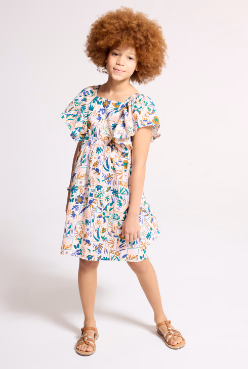 Abito beige stampato con maniche ad aletta con volant