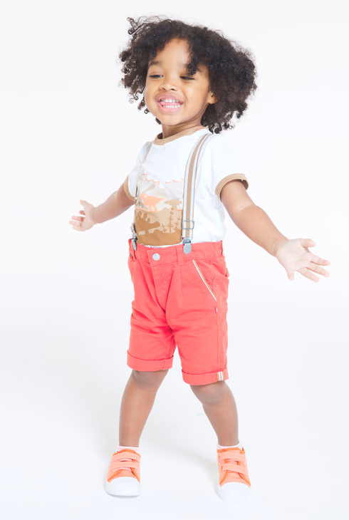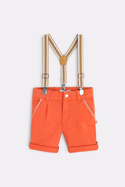 Bermuda in cotone fantasia con pince e bretelle arancione bimbo