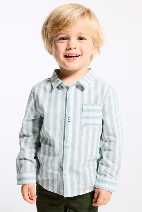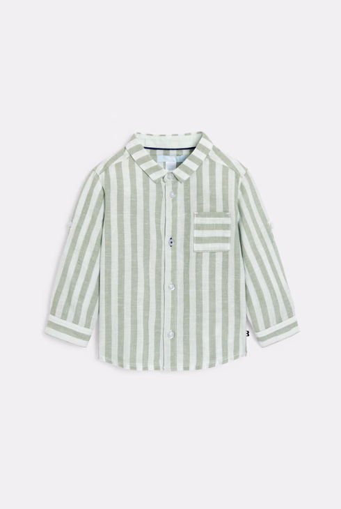 Camicia in misto lino e cotone verde a righe con maniche arrotolabili neonato