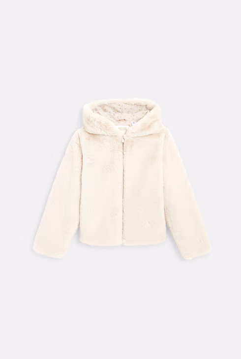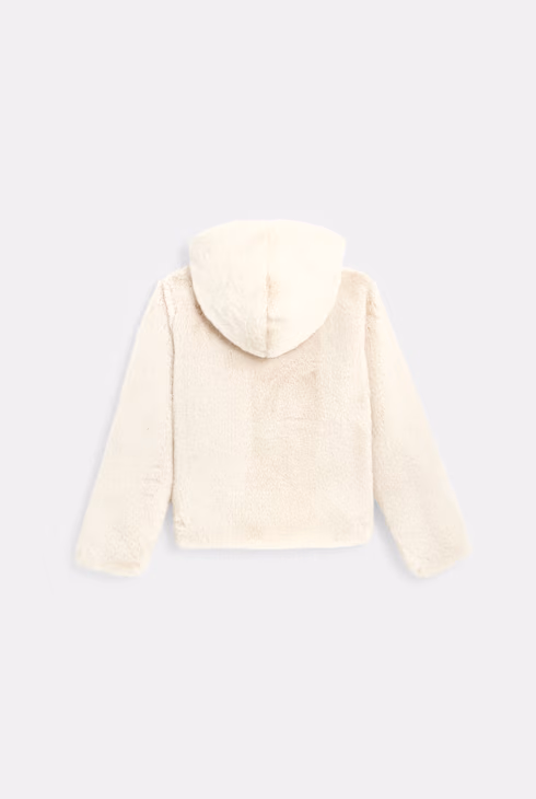 Giubbotto-maglione con pelliccia ecologica e cappuccio beige bambina