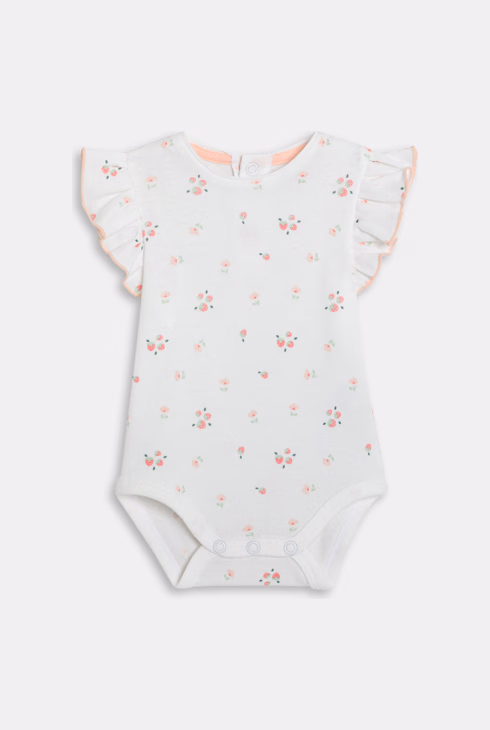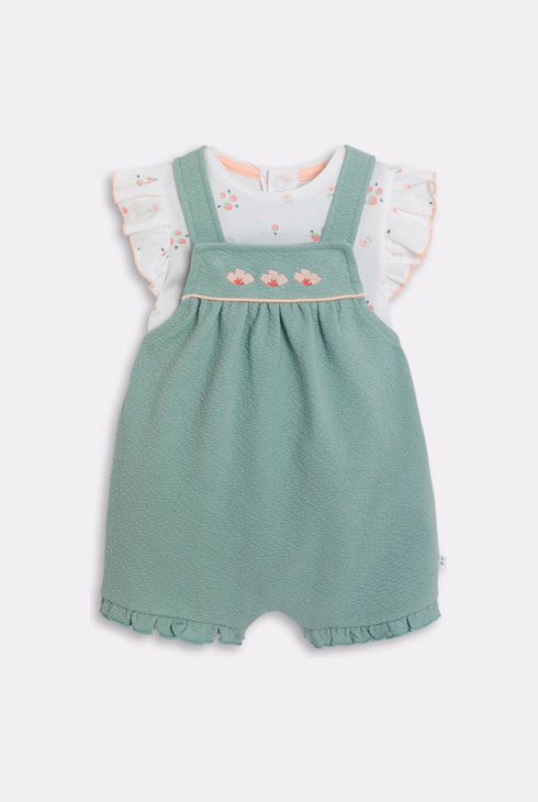 Salopette corta in cotone fantasia e body verde con fragole per neonata