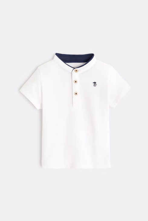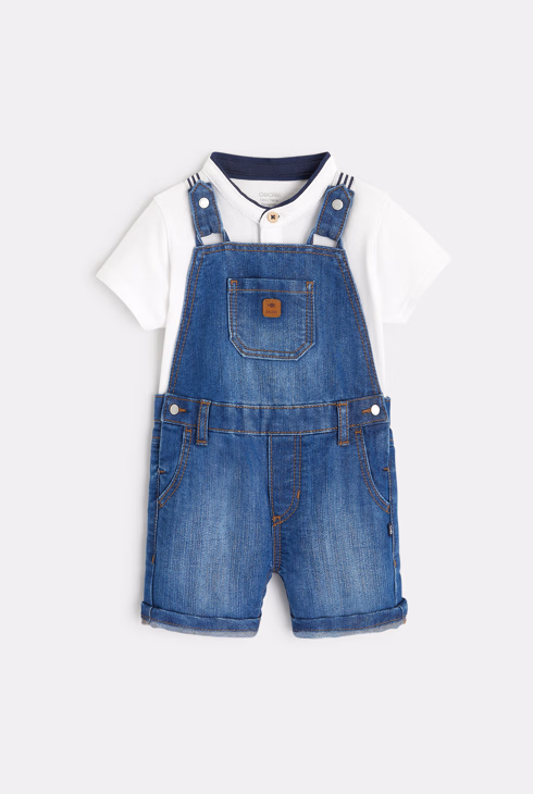 Salopette corta in denim e t-shirt serafino blu bimbo
