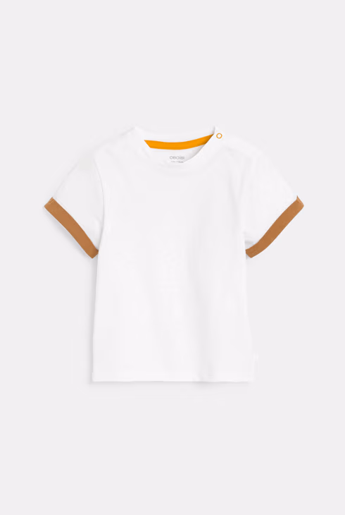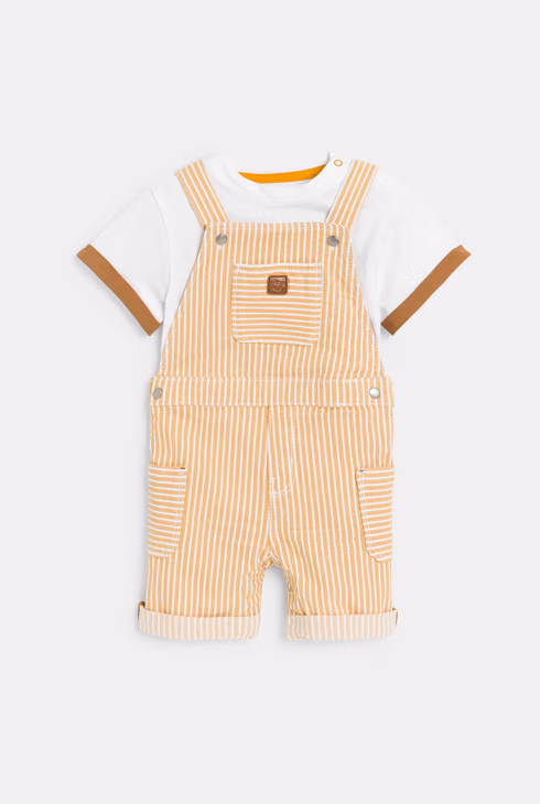 Salopettte in denim a righe e t-shirt gialla per neonato