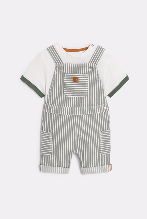 Salopettte in denim a righe e t-shirt verde per neonato