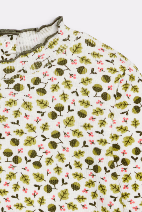 T-shirt a costine piatte con collo smerlato verde stampata per neonata