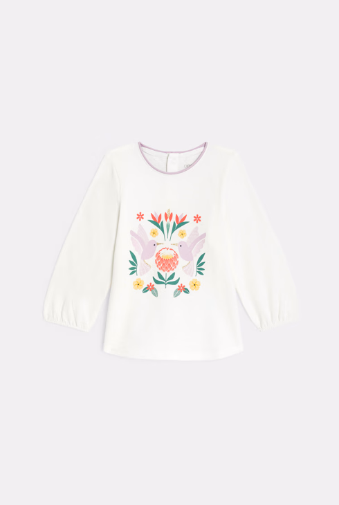 T-shirt a maniche lunghe bianca con animali uccelli per neonata
