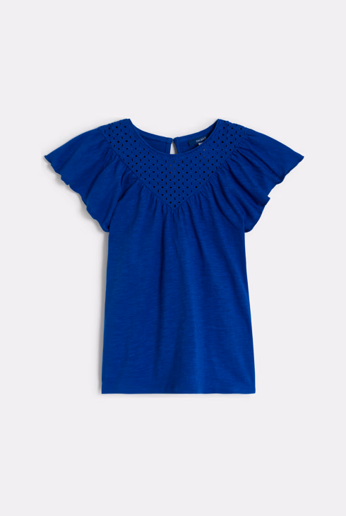 T-shirt blu a maniche corte con dettagli in pizzo sangallo per bambina
