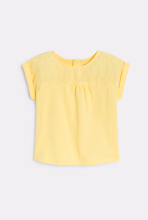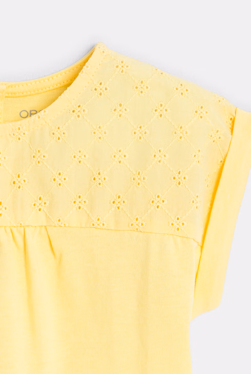 T-shirt gialla in bimateriale con pizzo sangallo per neonata