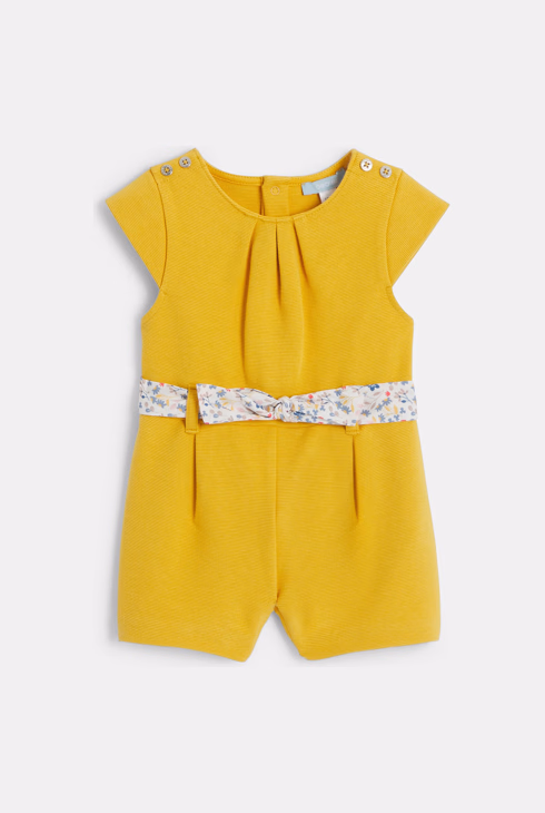 Tuta corta gialla fantasia con cintura floreale per neonata